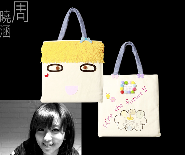 正面做了小孩的笑臉,小孩子最值得珍惜的就是純真,而純真最常從笑臉裡看到。背面寫了「u’re the future」,孩子就是世界的未來。提袋是編織品、頭髮是毛線、背後還有球球。
