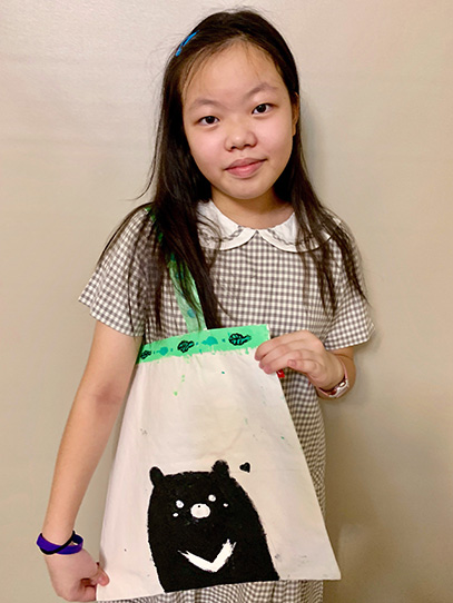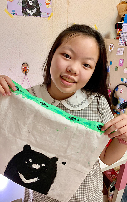 設計概念 : 我畫的是台灣黑熊,因為代表台灣的一種動物,也是台灣的一個吉祥物,希望可以帶來平安快樂的日子。現在防疫在家,還可以在家做公益,邊做自己有興趣的事,我覺得疫情緊張的時候我們現在已經很幸福了,要感謝許多在外面工作的人們,讓整個城市可以正常運作,我們也要做好自己該做的,希望疫情快點恢復。