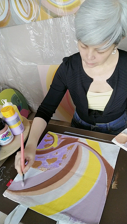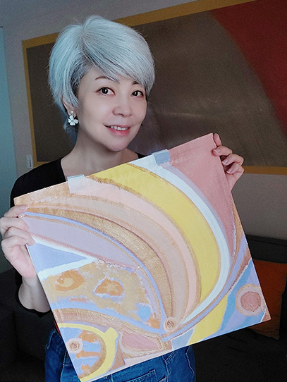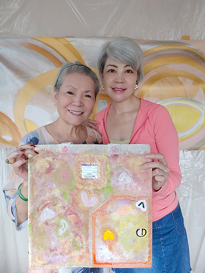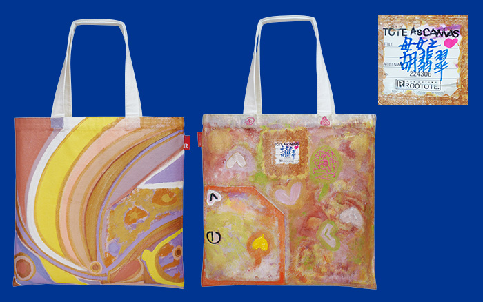 和媽媽創作時有許多感念;為減少她壓力,告訴她不用特別想就抽出畫筆、顏料隨心畫,我們便開心的把顏料混合,在布上玩出心中畫。她會在平淡顏色上加鮮明色彩,我會在她畫歪的心型外框邊,當下我心中好滿足又歡喜也在媽媽眼中看到許久未見的光彩。就在這樣的幸福中和媽媽完成了作品,希望大家喜歡也和我們一樣幸福喲。