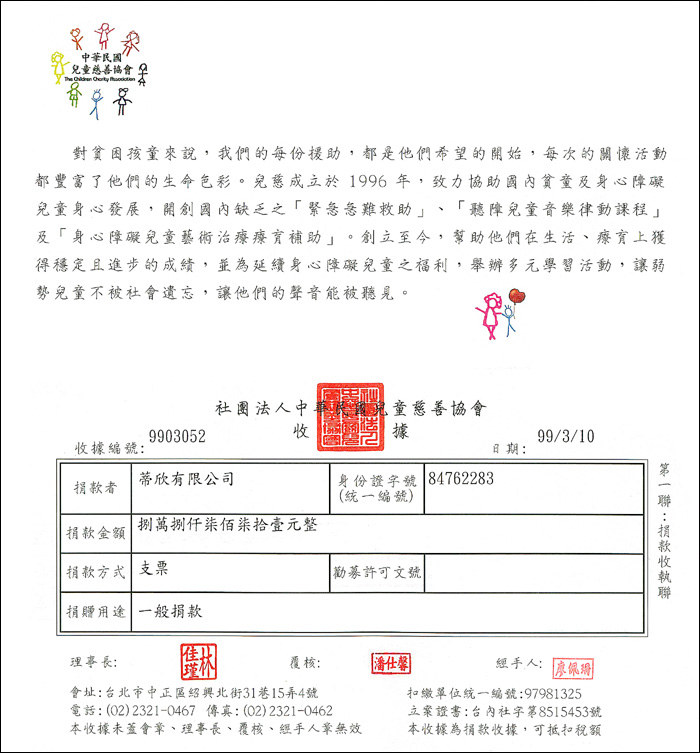 受贈單位:中華民國兒童慈善協會